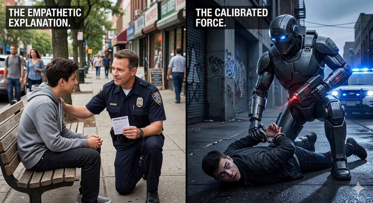 [Image Comparison: A human police officer showing empathy vs. an autonomous robotic unit enforcing protocol]